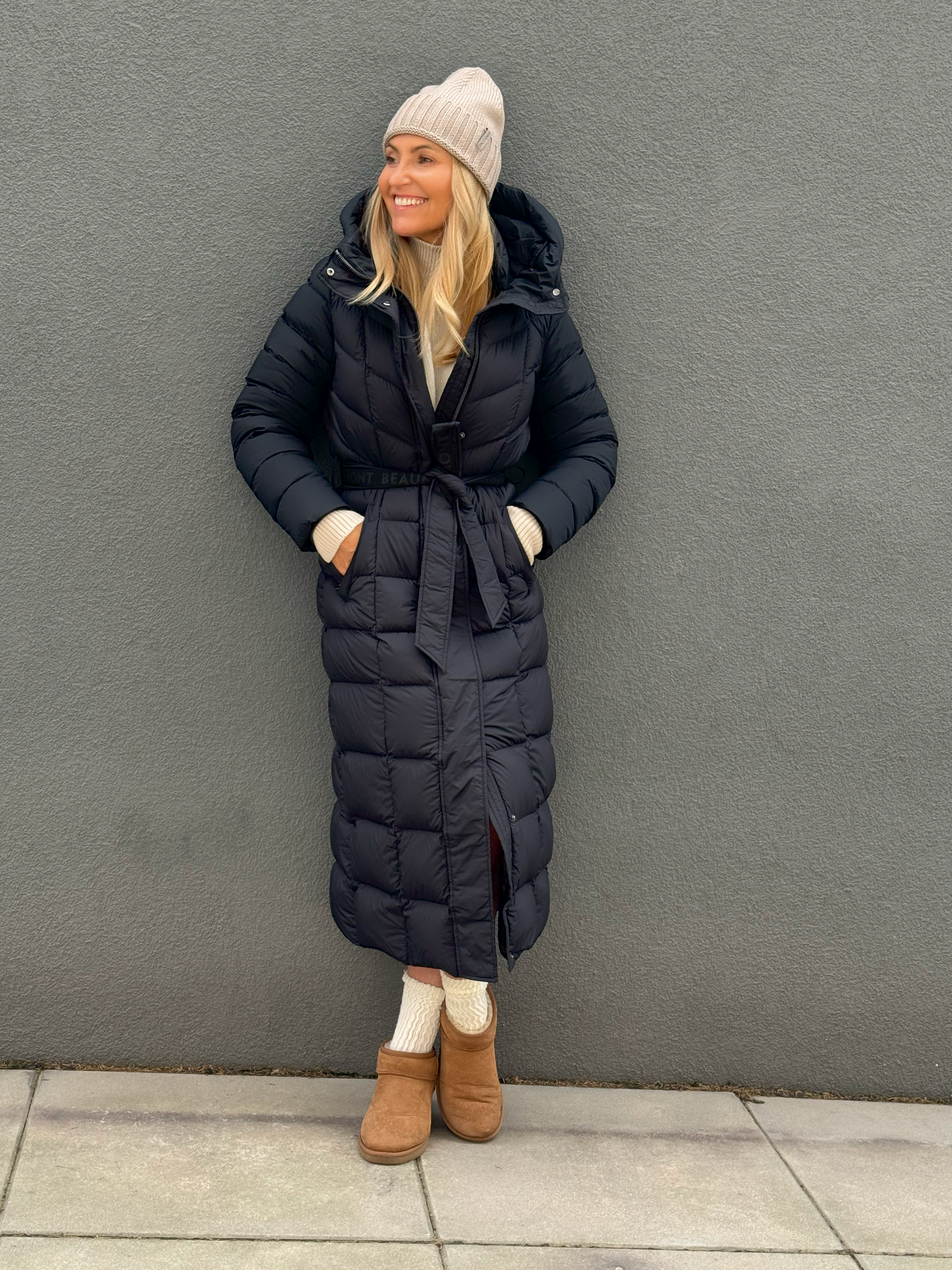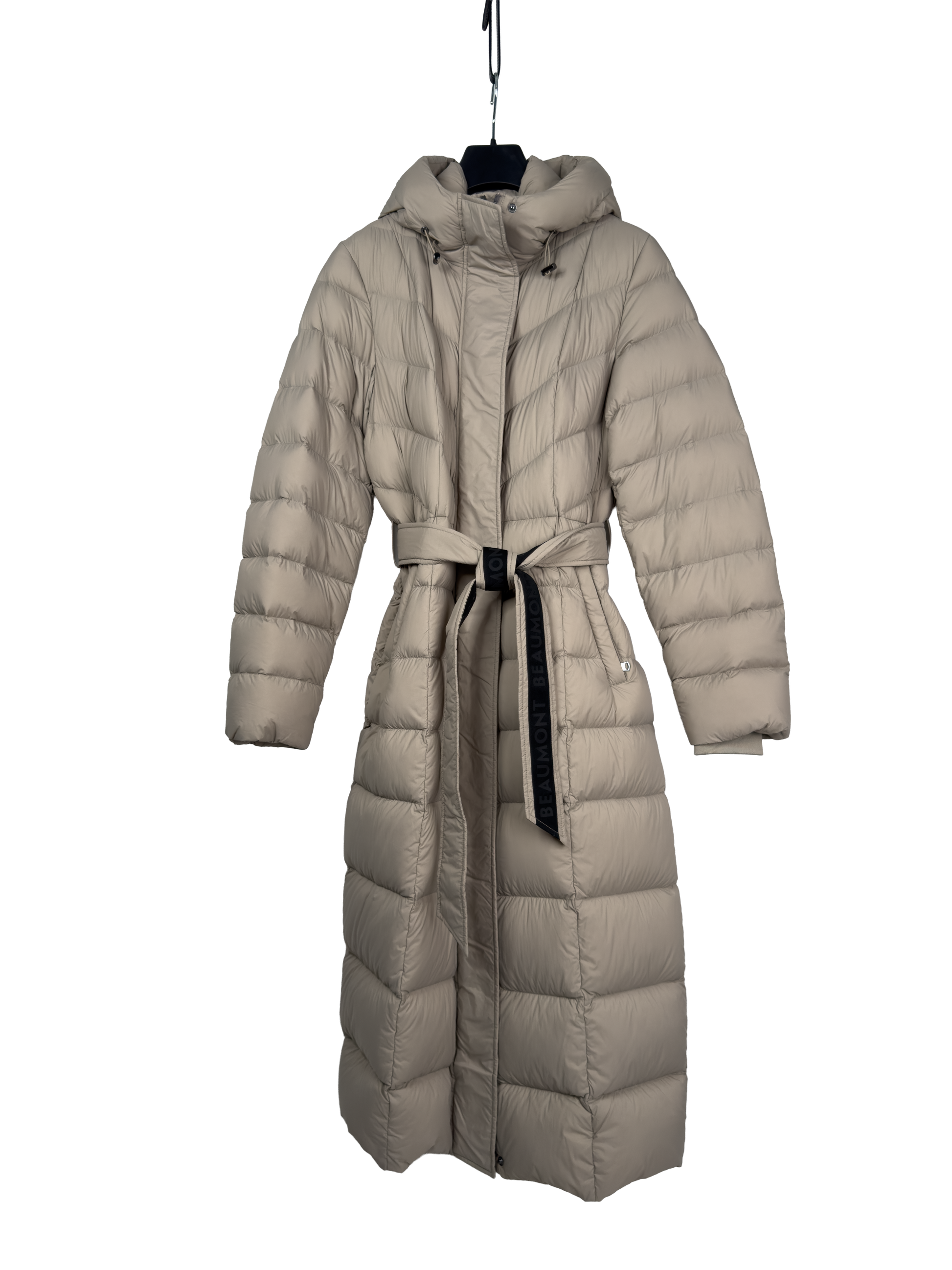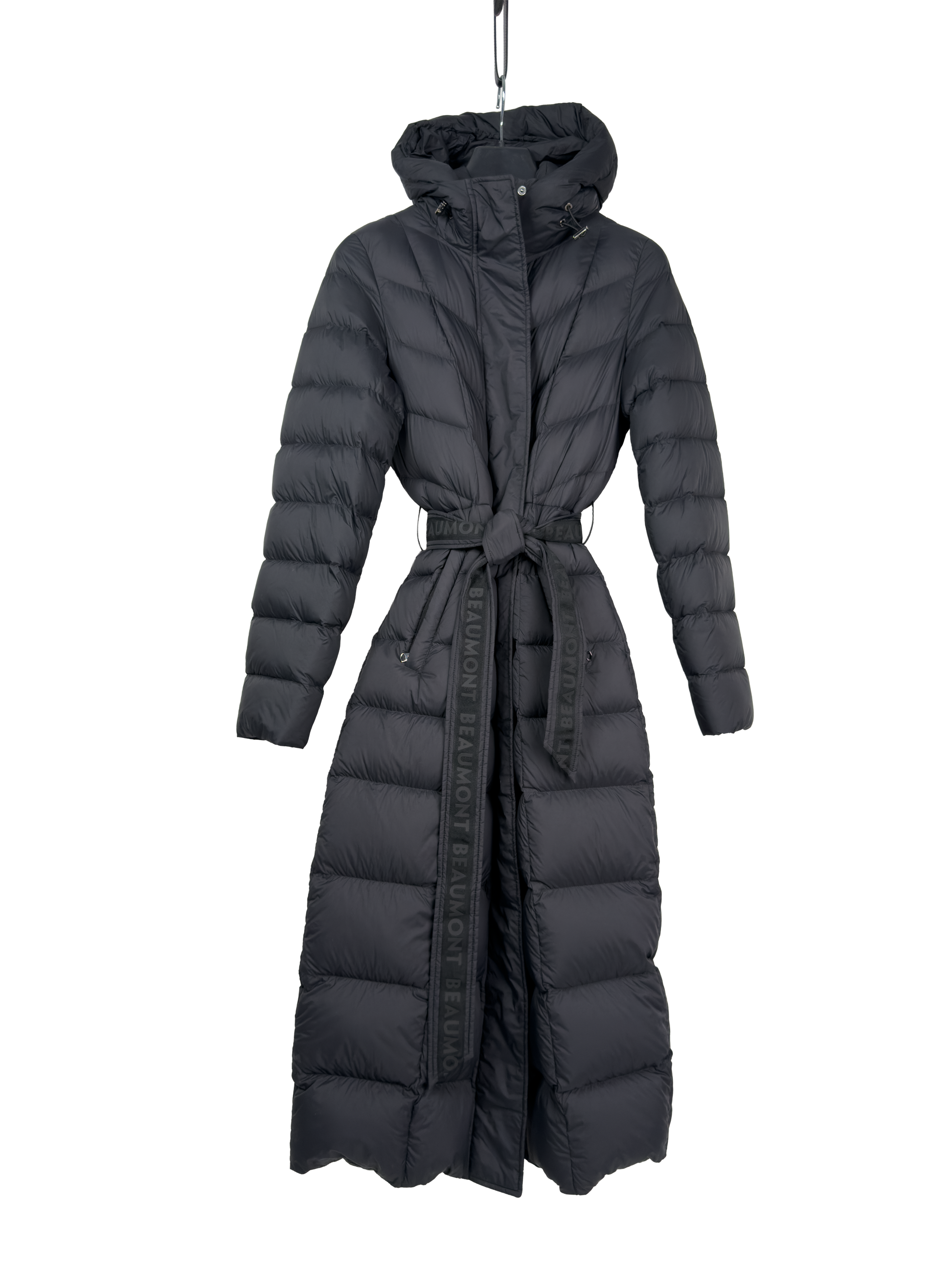 Luxusní a nadčasový dlouhý péřový kabát se zavazováním a kapucí