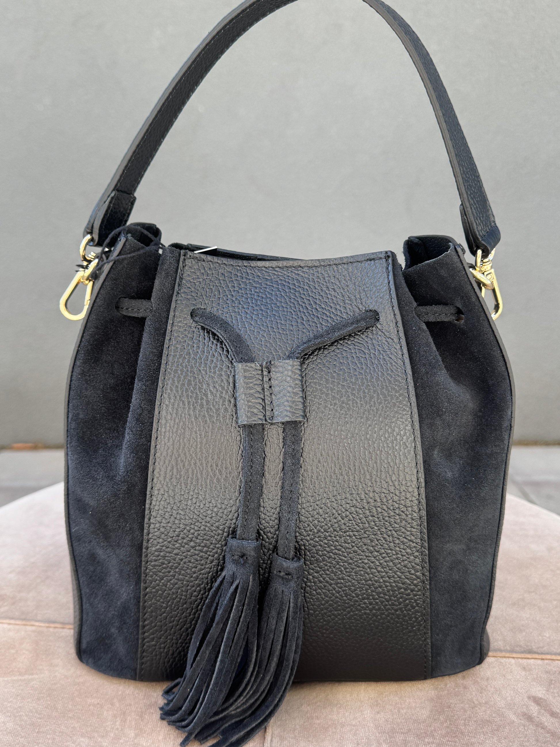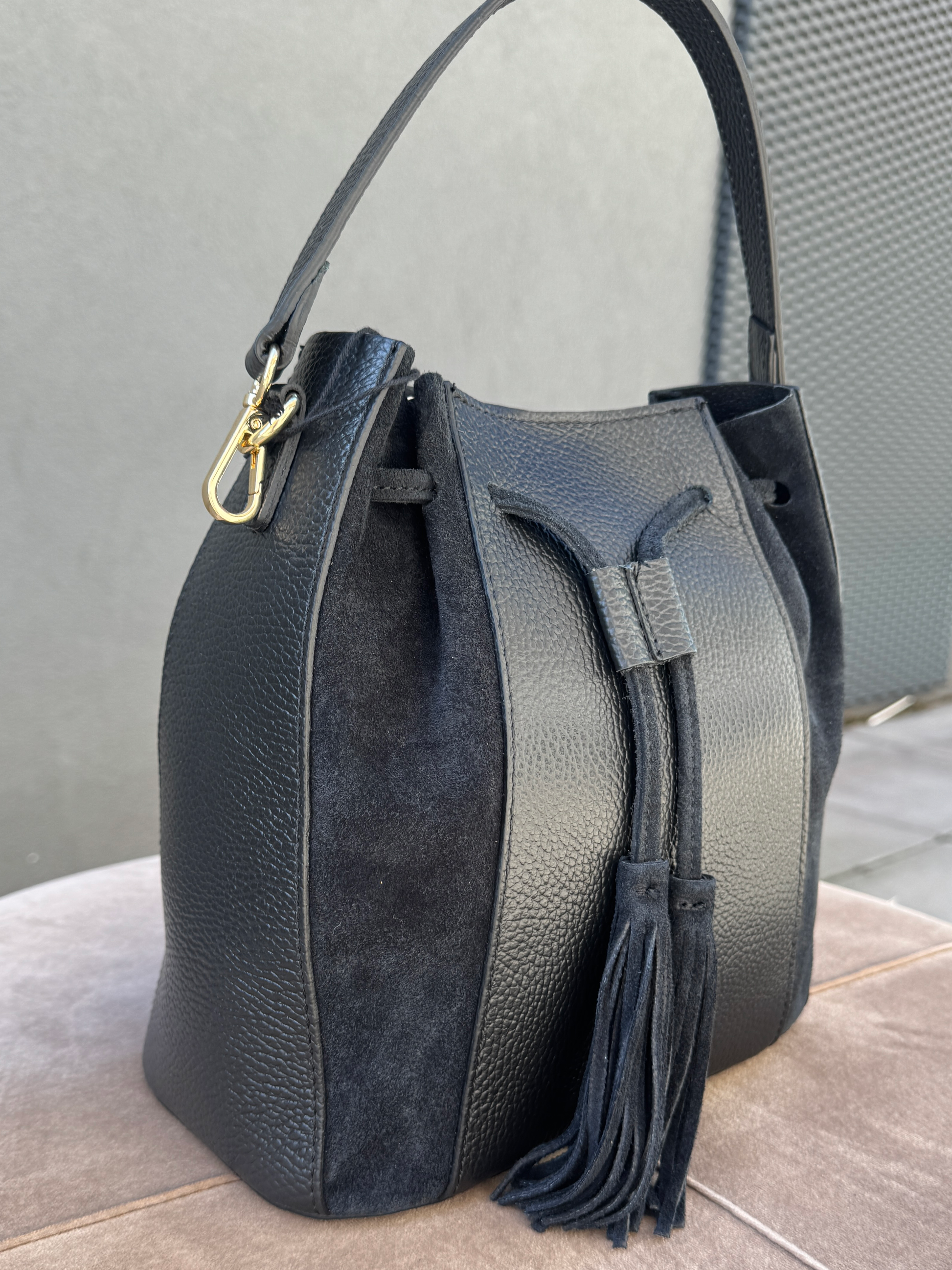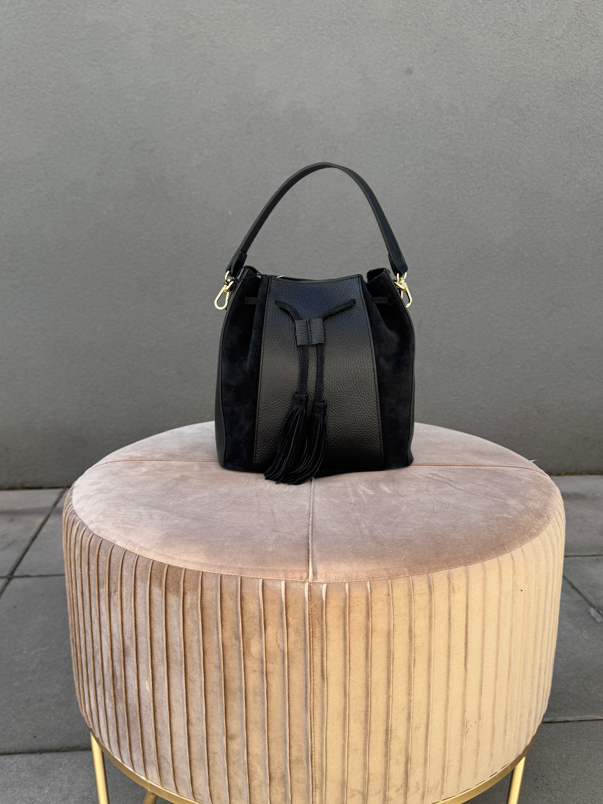Kožená kabelka v kombinaci s jemným semišem a střapci