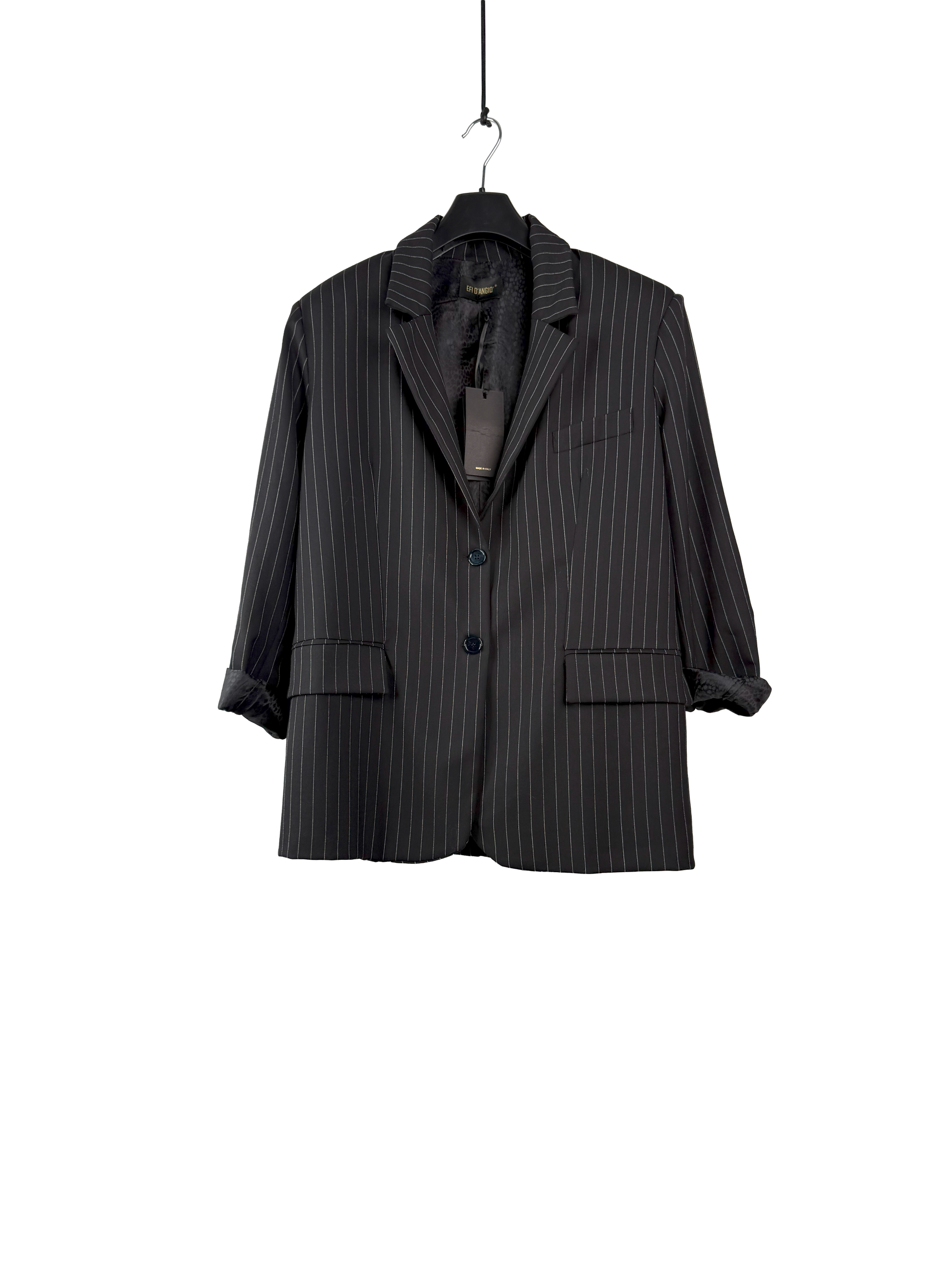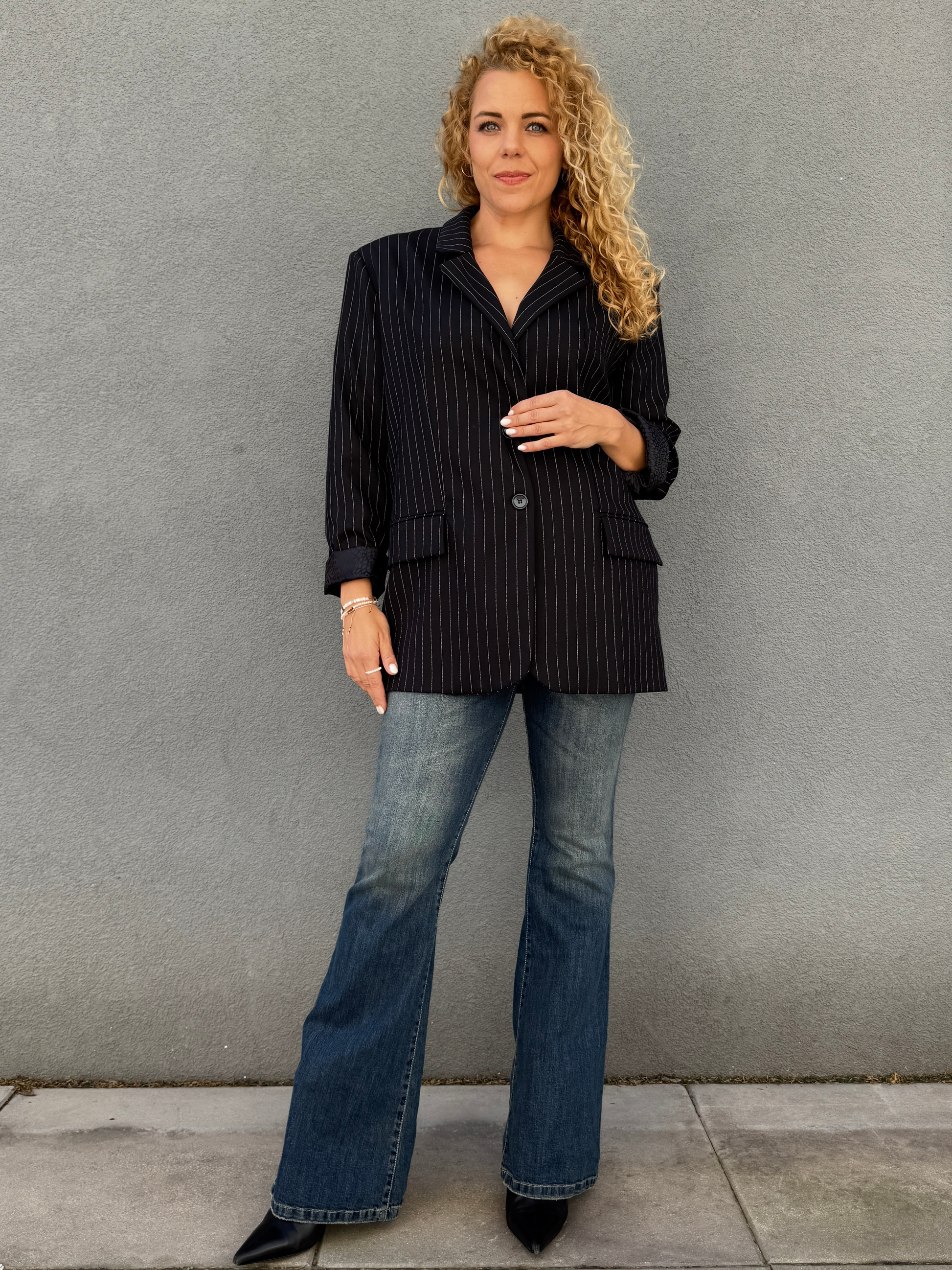 Elegantní oversize černé sako s decentními proužky, které působí profesionálně a nadčasově.